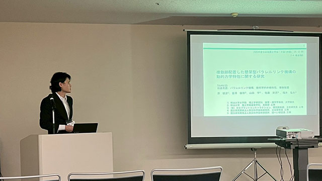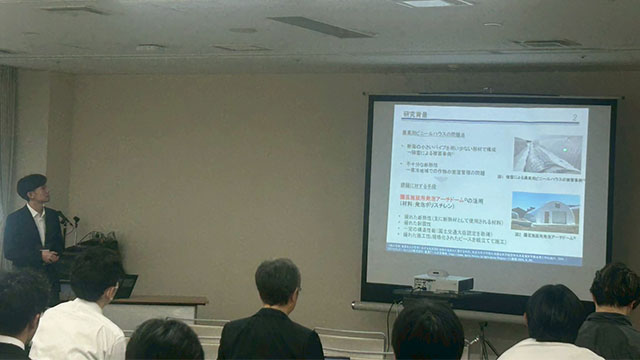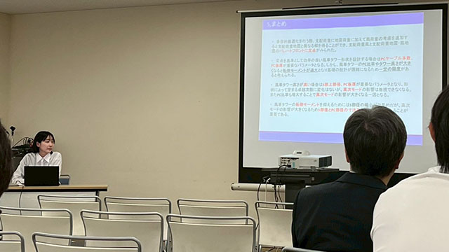 地震工学会の発表時間は発表8分+質疑3分とAIJと比較して長いため急いで話す必要がなくと最初は思いましたが、 AIJと比較して細かな分類分けがなく、研究対象が特殊(3次元免震・風車・発泡ドーム)な私たちは、研究対象に関する説明に時間がとられてしまい発表時間が足りなくなるのではないかというよくわからない不安を抱えて発表に挑みました。