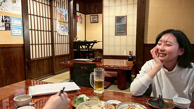 前日断念した民謡居酒屋へ行こうと思いましたが宿のエレベーターに、21時からロビーで民謡体験が開催されるとの張り紙が、、これは行かない手はないないとのことで参加しました。全然人いないだろうなーなんて思いながら向かうと、20名以上いた気がします、大盛況。筆者らはロビーど真ん中でしっかり爪痕残してきました(笑)。