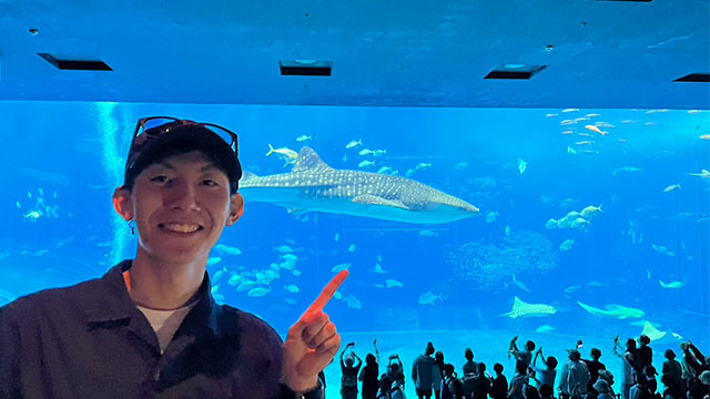 腹ごしらえを済ませた我ら一同は、社内で四方山話に花咲かせ、ついに美ら海到着。写真撮影もほどほどに、館内を色々見て回りました。ジンベイザメはもちろんのこと、かの有名なマナティー(有名だよな、、?)もしっかり目に焼き付けました。ちゃんと構造研らしく、大水槽のガラスの厚さにも感嘆しながらの散策です。美ら海は水族館だけでなく、隣接するビーチも見ものなのですね、大変美しく、良き眺めでした、、!…おっと忘れちゃいかん、先生から受注したクエスト<研究室の鍵に付けるキーホルダーを入手せよ>もしっかりクリアです。目的を果たし、美ら海を後にしました。かわいいジンベイザメちゃん(※全長10cm強)を購入しました。
