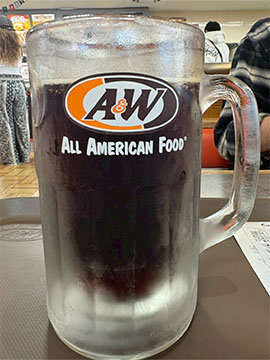 A&Wといえばハンバーガーとは別に、ルートビアなる飲み物が有名ですよね。筆者はだいぶクセのある炭酸飲料:ドクターペッパー(通称ドクペ)が大好きで、似たようなものだろうと高を括っていましたが、これが危ない危ない。店員さんが試飲させてくださり、九死に一生を得ました。アセアセ